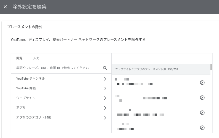 アプリやYouTubeなども除外可能。ただし、アカウント単位なので、他キャンペーンの干渉しないように十分注意してください。(他のキャンペーンでYouTube広告をやっている場合など、アカウントでYouTubeを除外してしまうと大変なことに!責任取れないので注意してください。)