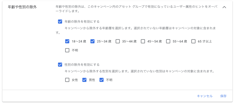 8月のアップデートで、「年齢」や「性別」の除外もキャンペーン単位で設定できるようになりました。こちらも地味に嬉しいアップデートです。