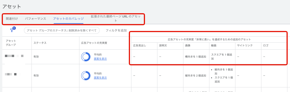 →設定できていない。。広告アセットの充実度は上げていきましょう!