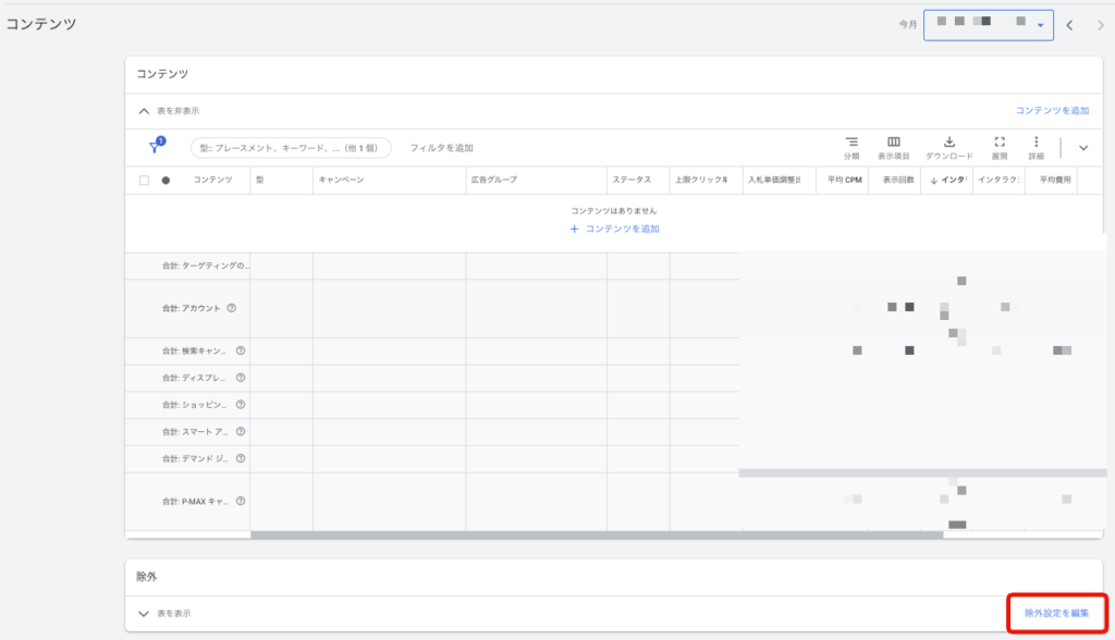 【すべてのキャンペーン】→【左メニュー】→【オーディエンス、キーワード、コンテンツ】→【コンテンツ】→下のほうの【除外】の表から、右上の【除外設定】