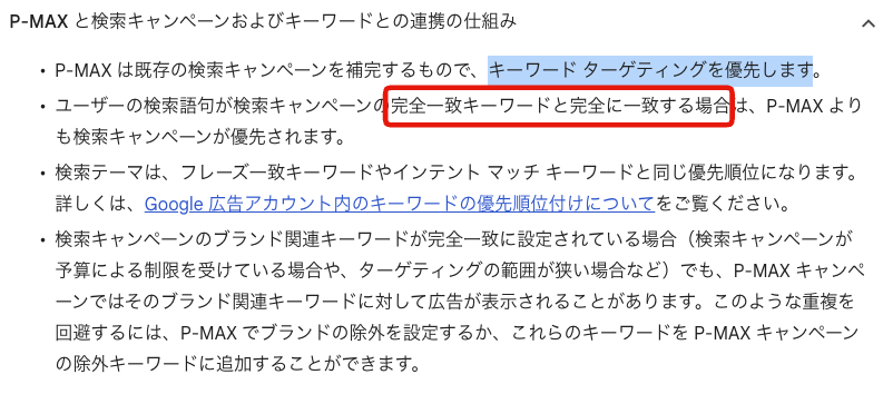 なお、「P-MAXって結局、他のキャンペーンとどんな関係性なの?」という疑問はあると思いますが、まだ、「検索」についてはまだP-MAXより、既存の検索キャンペーンの方を優先してくれるようです。