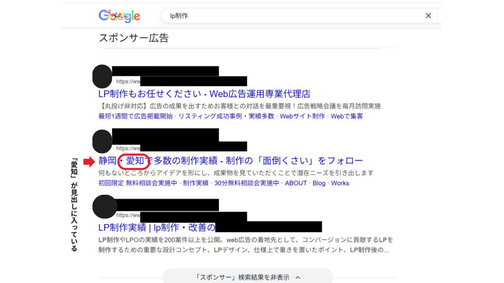 このように、確認ができるので、自分がターゲットに設定したエリアの広告文も確認することができます。