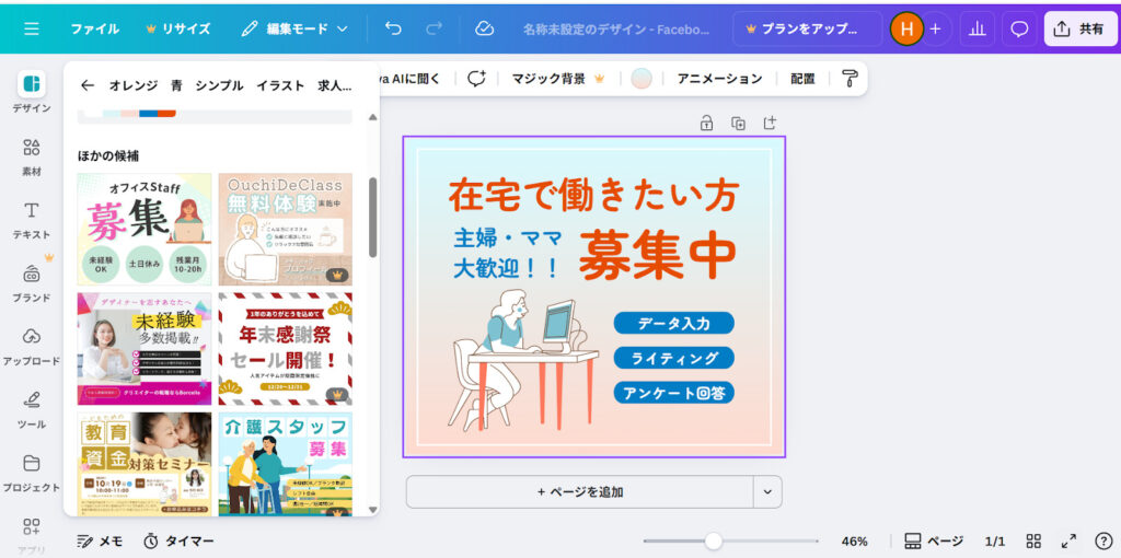 右下に王冠のマークがついているものは、有料版でしか使用できないデザインテンプレートですが、無料版のテンプレートだけでも十分にデザイン作成はできます。