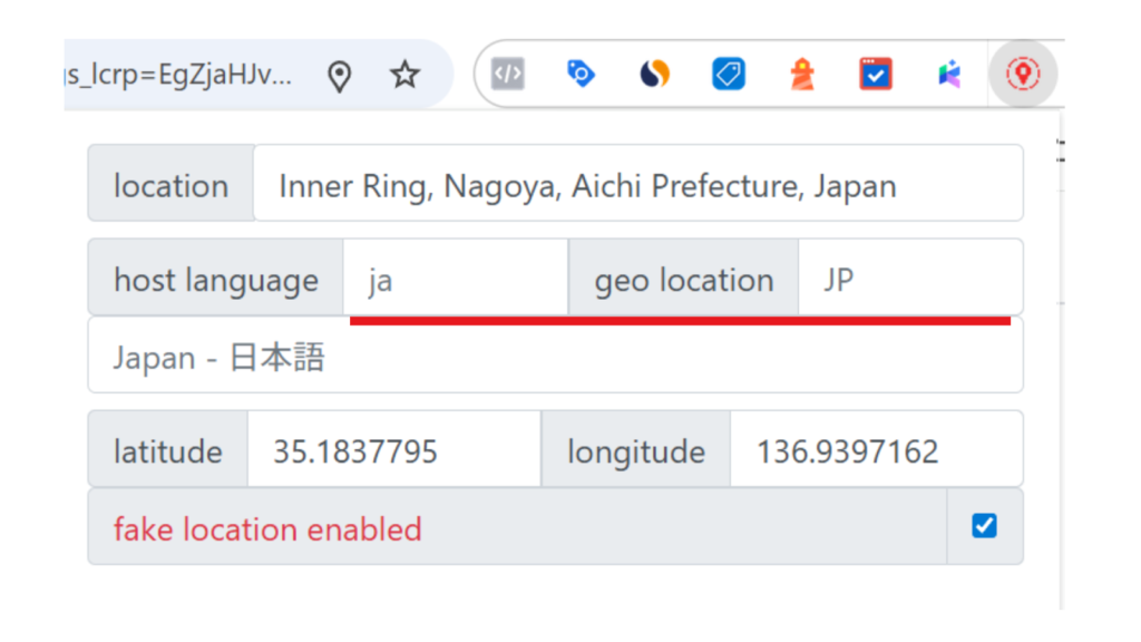 host languageを「ja」にし、get locationを「JP」に設定し、enable overwriteのチェックボックスを入れると「fake location enabled」と赤文字に代わり、右上のアイコンも赤色になります。