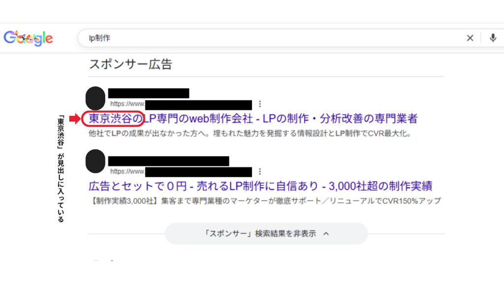 実際に検索すると、下記の広告のように「東京」が入った広告が表示されます。また、推測として「東京」をターゲットエリアに指定した広告が表示されます。