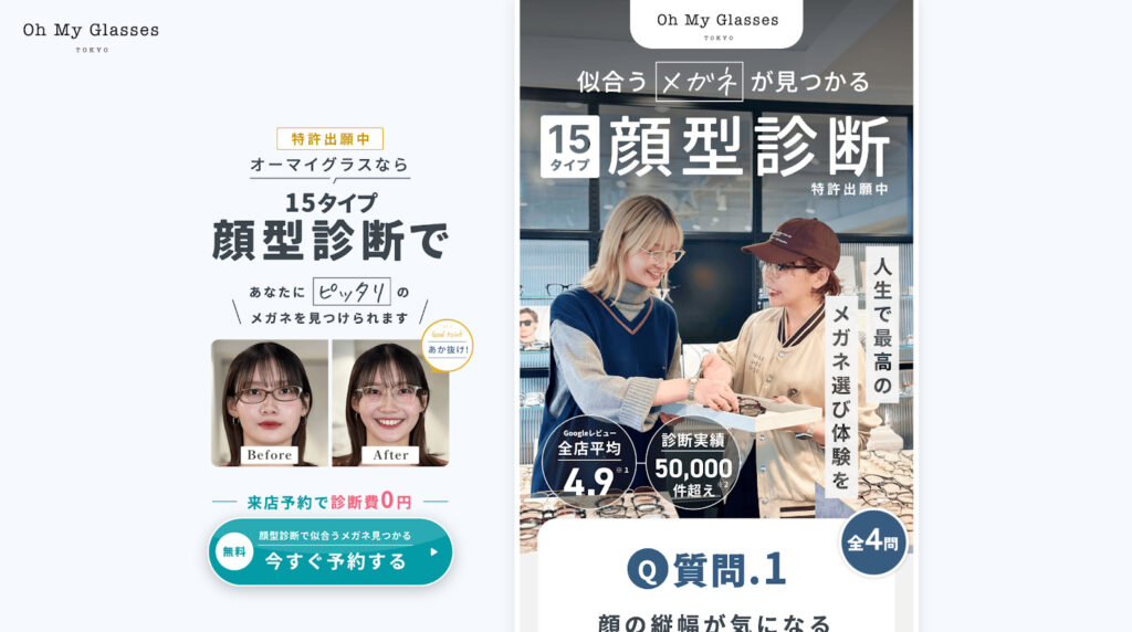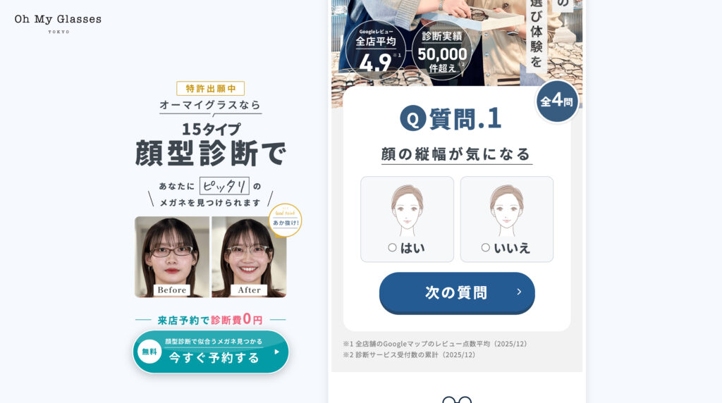 ユーザーがその場で気軽に体験できる簡易顔型診断コンテンツを設置し、楽しく診断結果を見ていただいた上で、「もっと詳しくプロの診断を受けたい」と思ったタイミングで、自然に店舗来店予約へと導く動線を設計したのが、このランディングページの最大のポイントです。