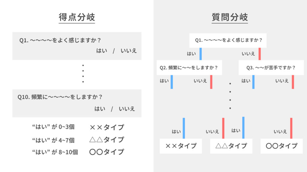 - 得点分岐:回答内容に応じてスコアを加算・減算し、合計点によって結果を分岐させる方法