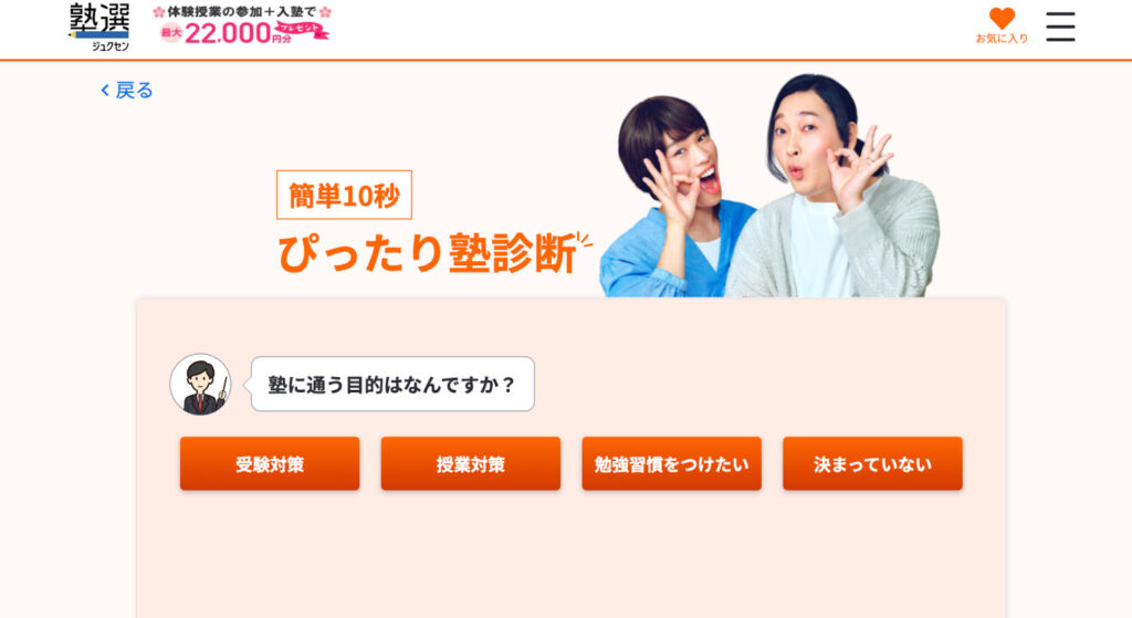 ユーザーの学習状況や目的を「簡単な質問」で整理し、最適な塾タイプへと導く設計が特徴です。