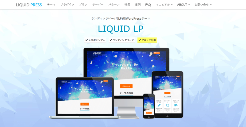 LIQUID LPは、LP制作に特化したWordPressテーマです。あらかじめ用意されたテンプレートを選び、管理画面から直感的に編集できるため、専門知識がなくても本格的なLPを作成できます。レスポンシブ対応でスマホ表示にも最適化されており、WordPressで手軽にLPを運用したい方に向いています。