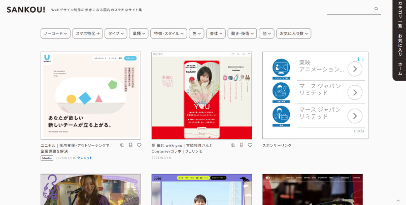 SANKOU!は、デザイン性の高いLPやWebサイトを厳選して掲載しているギャラリーサイトです。トレンド感のあるビジュアルや、洗練されたレイアウトが多く、初心者の方がデザインの方向性を考える際の参考になります。